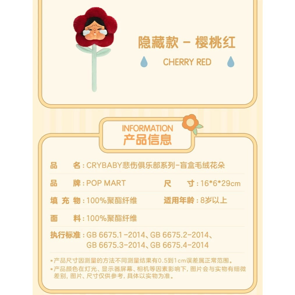 Add a splash of personality to your space with the CRYBABY Sad Club Flower Plush Series! Will you uncover the exclusive Cherry Red flower? Start your collection today and let the magic bloom!