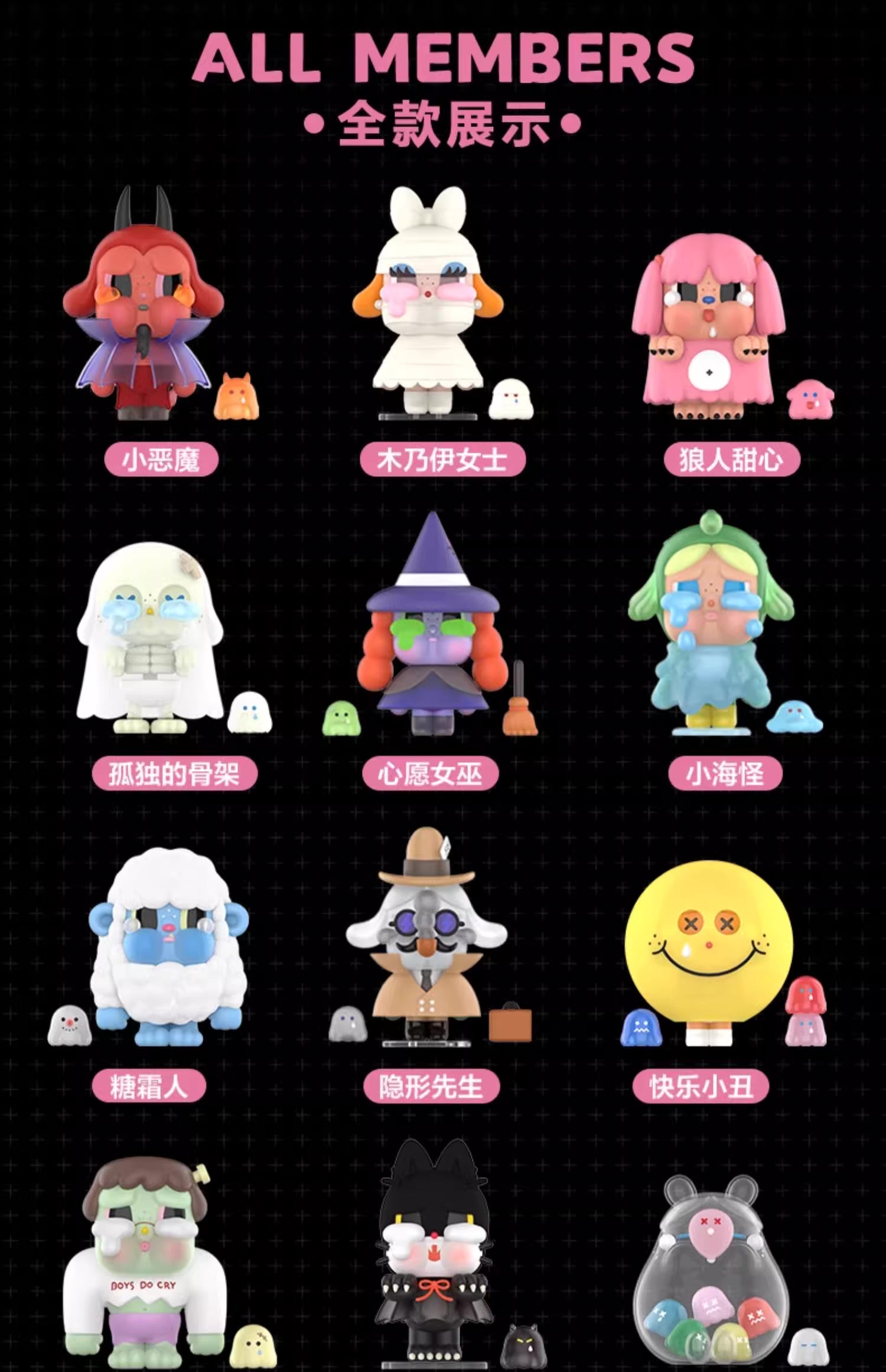 Each box holds a delightful surprise, revealing one of the expressive characters, including Little Devil, Mummy Lady, Sweetheart Werewolf, Lonely Skeleton, Wishful Witch, Little Sea Monster, and many more. From the mischievous grin of Happy Ball to the mysterious allure of Invisible Man, every figure is brimming with personality and storytelling charm.