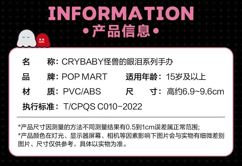 Ideal for collectors aged 15 and above, this series brings a playful yet emotional twist to the world of designer toys. Whether you’re expanding your POP MART collection or discovering it for the first time, the Crybaby Monster Tears Series is here to tug at your heartstrings—one tear at a time!