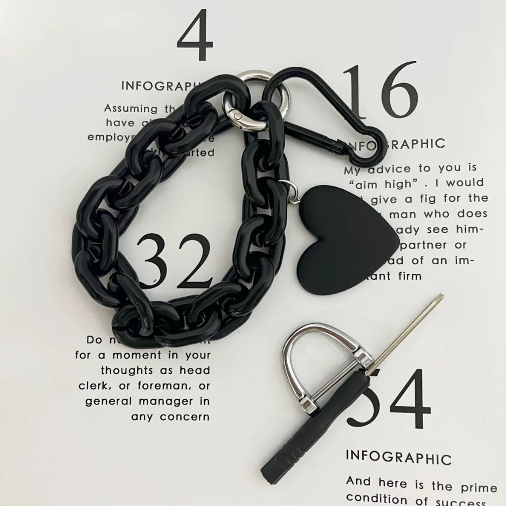 • Glossy black chain paired with a sleek black heart and a bold yellow crescent moon.